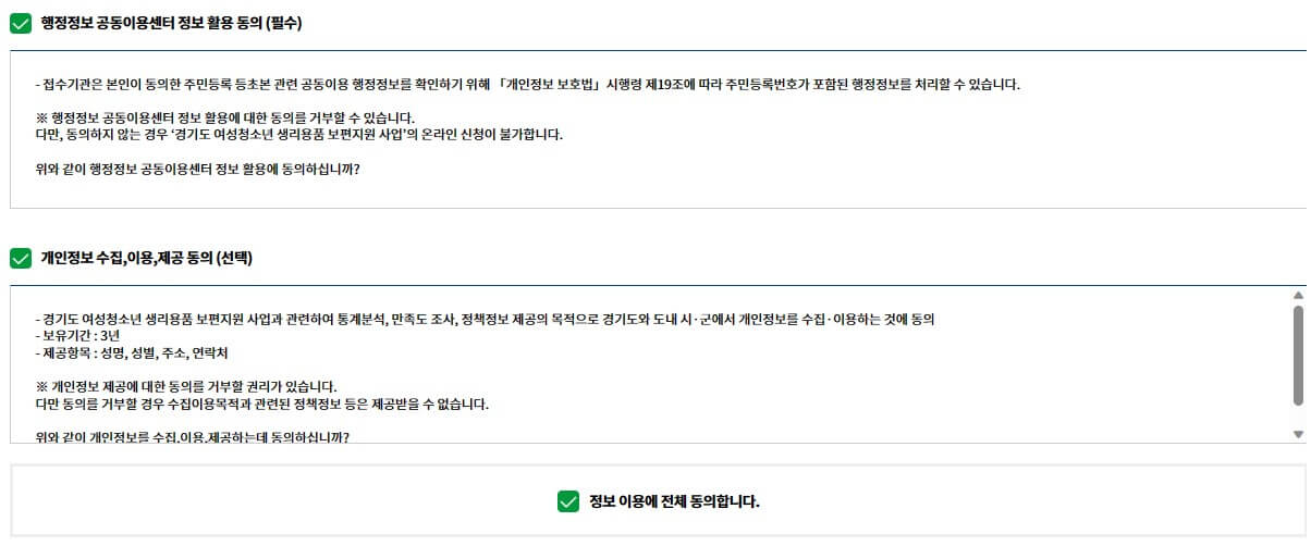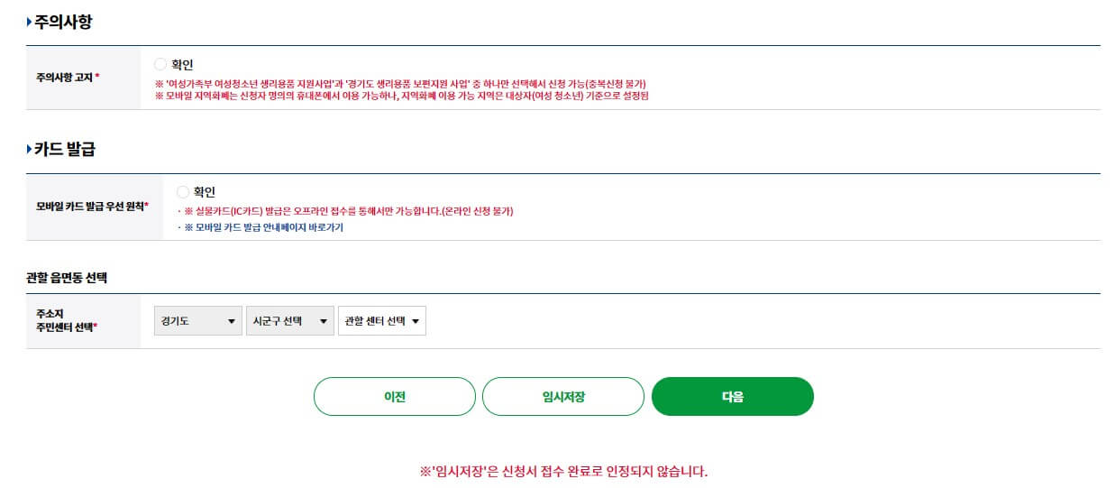 경기지역 화폐 모바일 카드를 발급 받으셨다면 경기민원24 ', '바우처' 여성 청소년 생리용품 보편지원 사업' 신청 페이지로 가셔서 신청을 계속 진해하시면 됩니다. |