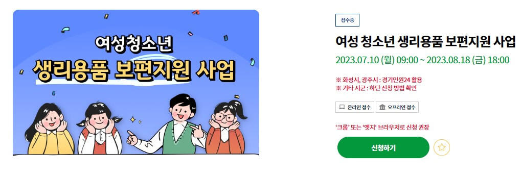 경기도 22개 시·군에서 다음 달 18일까지 '여성청소년 생리용품 무료 지원 사업을 시행하여 오늘(10일)부터 하반기 온라인 접수 신청을 받고 있습니다. 지급 방법은 지역 화폐를 통한 지급이라고 하니 신청 방법 확인해 보세요.
