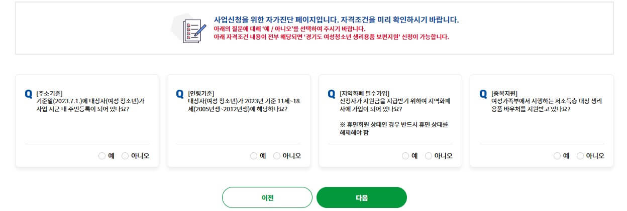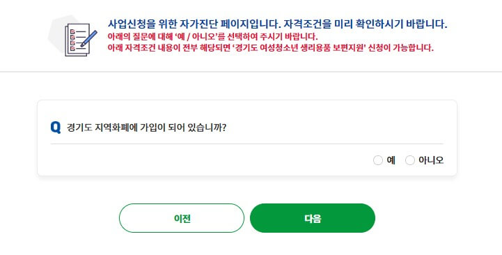 | 3. 지역화폐 가입 되어 있는지 선택 | 4. 신청 대상자(여성 청소년)) 자격 조건 확인 하기 |