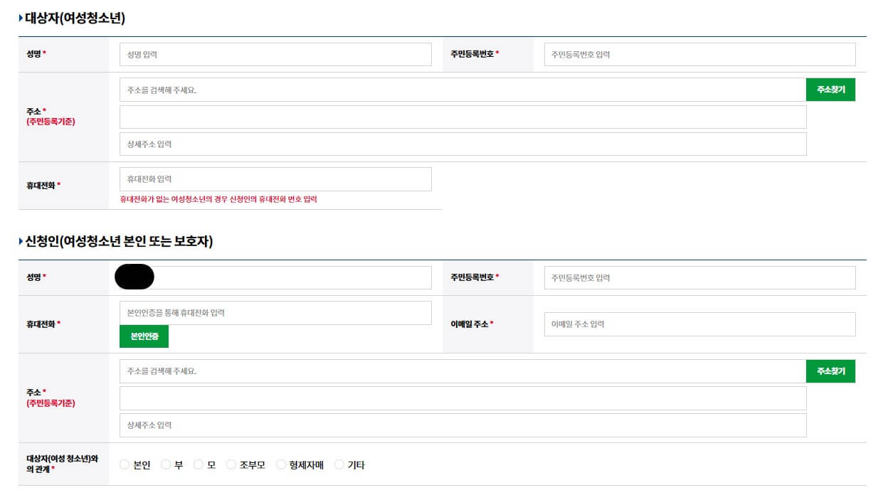 ▷ 신청일 기준 현재 해당 (22개 참여) 시군 내 주민등록을 둔 만 11세 ~ 18세 여성 청소년