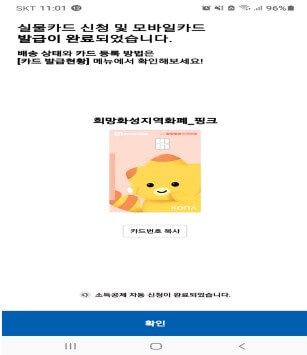 | 7. '카드신청하기' 버튼을 눌러주세요 | 8. 주소 입력 후 실물 카드 신청 및 모바일 카드 발급이 완료됩니다. | |