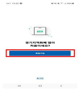 | 1. 경기지역 화폐 앱을 다운로드하고 실행해주세요 | 2. '회원 가입' 버튼을 눌러주세요 | 3. 서비스 약관에 동의해주세요 |