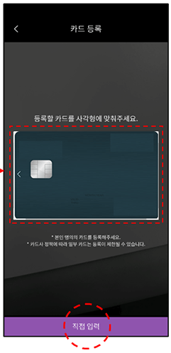 | 1. 권종 선택하기 | 2. 충전수단 선택(카드) | 3. 신용 / 체크카드 스캔화면 |