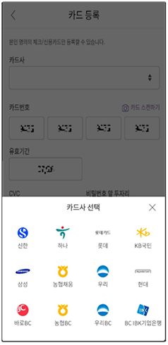 | 4. 카드사 선택화면 | 5. 신용 / 체크카드 등록화면 | 6. 카드 발급 화면 |